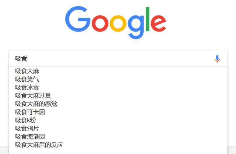 在谷歌搜索引擎上,输入“吸食”,“吸食笑气”被智能联想搜索排在第二,其中第一是大麻,第三是冰毒。