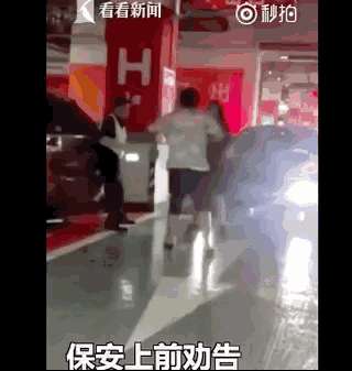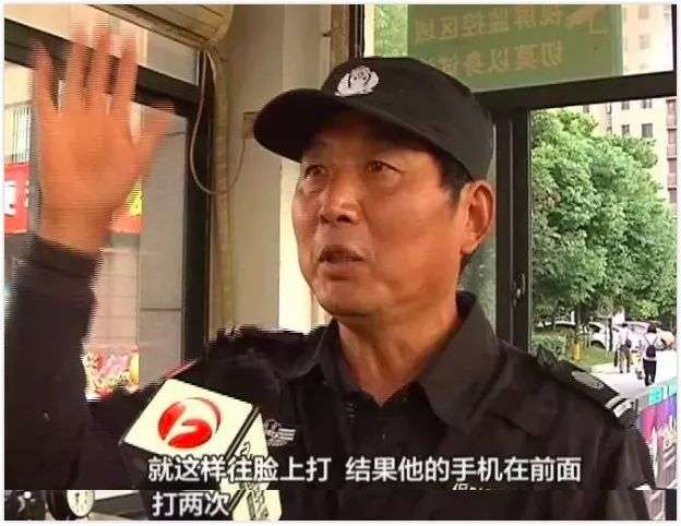 没想到车主突然发难,一边咒骂着,一边把拖鞋脱下来,追着保安打。为了借力,他甚至还跳起来打。
