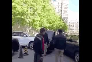清洁工人甚至被拽着趴在车前盖上,仿佛砧板上的肉一般,但嘴里还在不停地说着“对不起”。