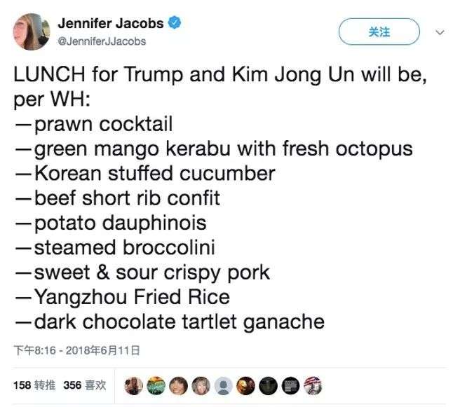 1点40分,扩大会议结束,两人共进工作午餐。不同于外界预测的汉堡,菜单可谓“美朝合璧”,有鱼有肉,符合两位领导人的味蕾,其中还有扬州炒饭。餐后两人一同去草坪散了一圈步。