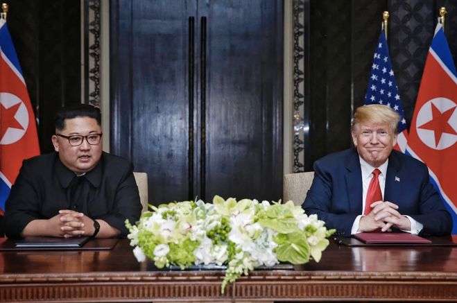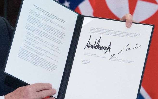 签署协议后,两人面露微笑,特朗普还迫不及待地向媒体出示他在文件上的签名。当在场记者问到是否会提到无核化时,特朗普说,我们很快会开启进程。
