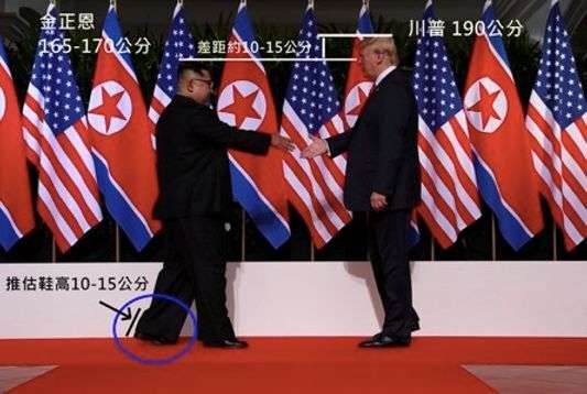 据韩媒报道,金正恩身高约为1米68,体重达130公斤。特朗普的身高大约1米9,体重为107公斤。韩媒因此认为,金正恩为了站在特朗普旁边,今天特地穿了至少7公分的中跟鞋。