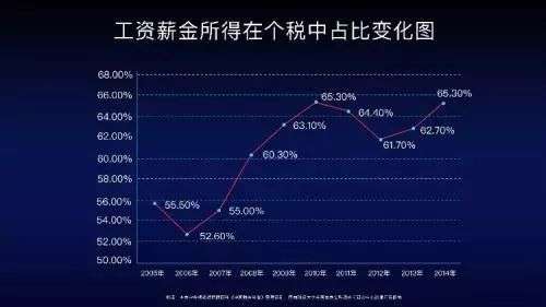 而从2005年到2014年,工薪资金在个税中的占比,稳定地保持在50%以上。且10年间,增加了近10%。