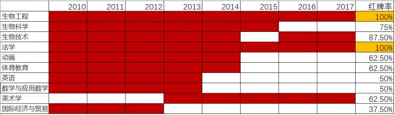 而生物工程专业,从2010起连续8年被评为红牌专业,生物技术和生物科学专业也不甘落后,红牌率都在75%以上。