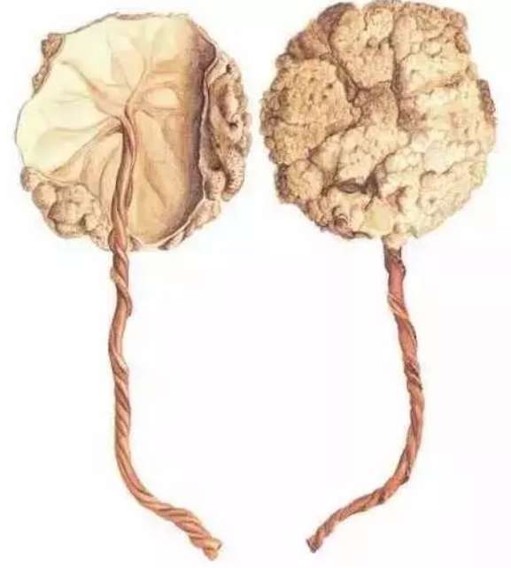 那暗红或紫红色的一团,长约20厘米,中部大约3厘米厚,还拖着一根长长的尾巴,即脐带。在脐带和胎盘连接处,分布着伞状的血管。