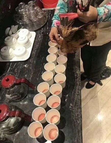 两列水杯依次排开,一人抓住鸡,鸡头凑近杯口,往杯里倒血。
