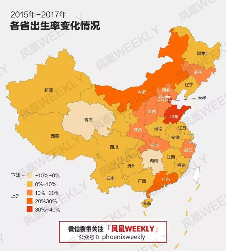 全国34个省市自治区,2/3的地区出生率涨幅低于10%。不过仅有青海、湖南两地,出现出生率负增长。