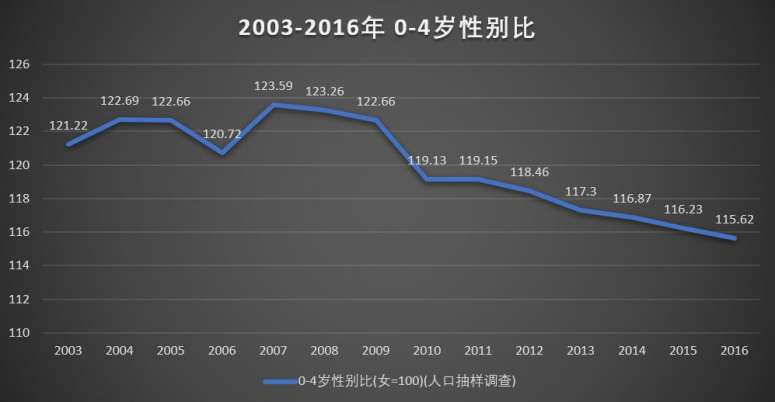 从下图2003年到2016年0-4岁儿童的性别比中可看出,男孩比重居高不下。