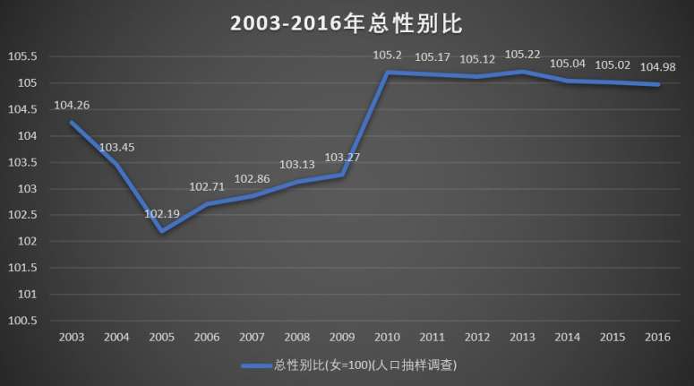 这一比例到2016年,二胎政策施行1年多后,下降至104.98。
