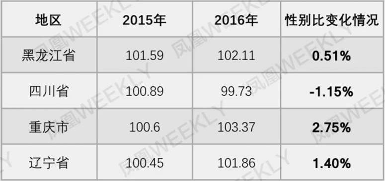 而在2015年,性别异常低(女性异常多)的4个地区,有3地上升趋近正常值。