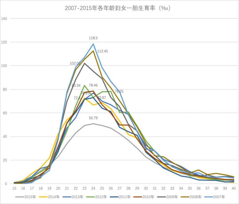 从峰值数据来看(23-24岁女性为生育峰值),一胎生育率峰值,已从2007年的118.5‰,下降至2015年的50.79‰。