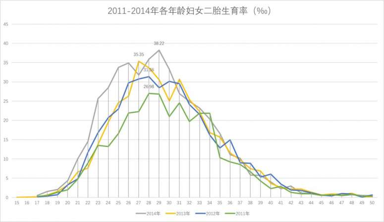 2011-2014年的抽样调查显示,4年间,二胎最高生育率上升了11.24‰。