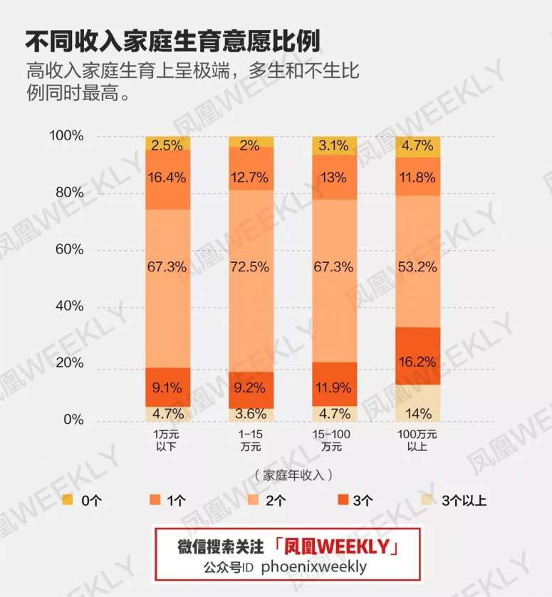 调查中,高收入人群里,不想要孩子的人,和想要3个以上孩子的人,比重都是最高的。