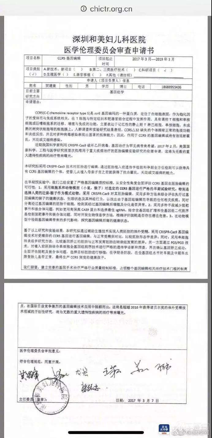 在一份由深圳和美妇儿科医院医学伦理委员会做出的审查申请书中,他兴奋地认定,“这将是超越2010年获得诺贝尔奖的体外受精技术领域的开创性研究,将为无数的重大遗传性疾病的治疗带来曙光。”