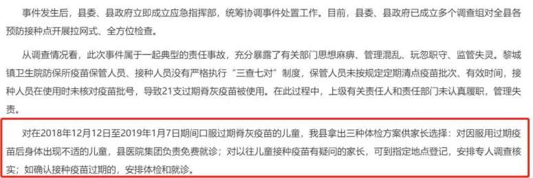 对在2018年12月12日至2019年1月7日期间口服过期脊灰疫苗的儿童,我县拿出三种体检方案供家长选择:对因服用过期疫苗后身体出现不适的儿童,县医院集团负责免费就诊;对以往儿童接种疫苗有疑问的家长,可到指定地点登记,安排专人调查核实;如确认接种疫苗过期的,安排体检和就诊。