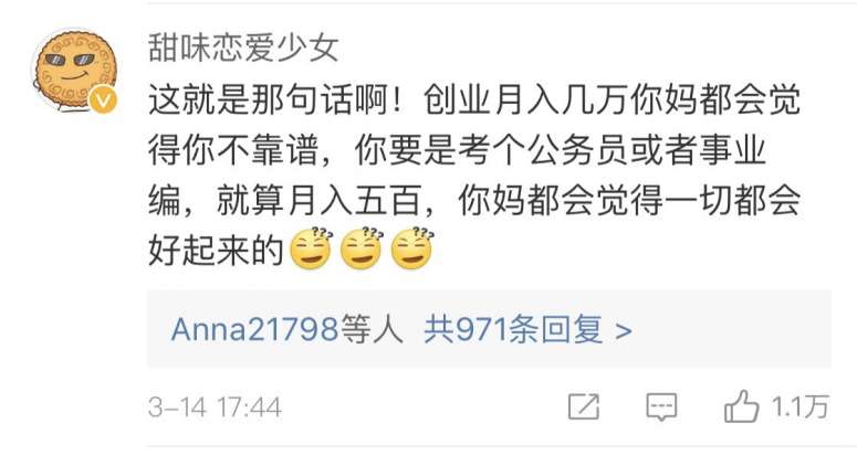 在父母眼里,只要你不是公务员,哪怕你月入百万,也是不稳定;你要是进个事业编,就算月入五百,都觉得一切会好起来。