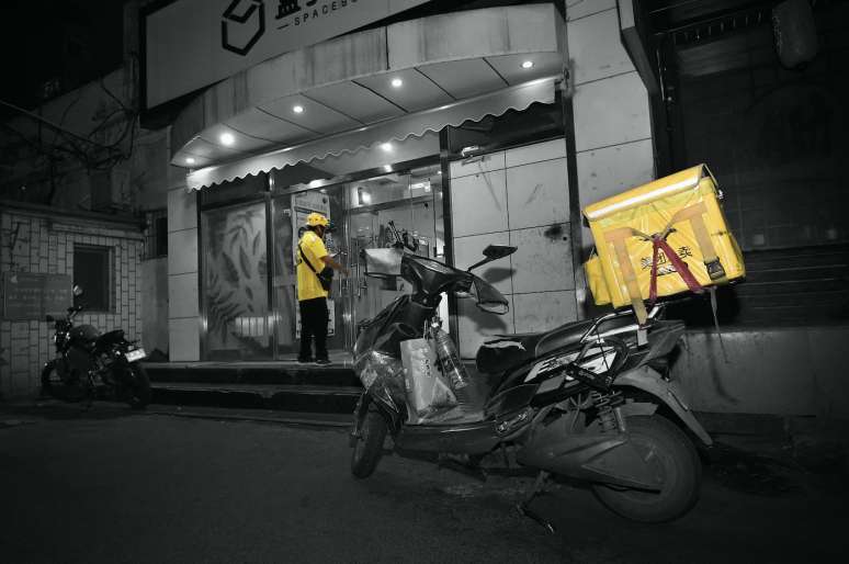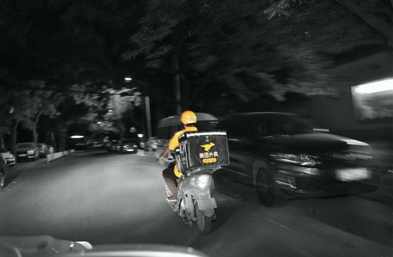 “您有新的美团外卖订单,请及时处理”。十多分钟后,一道黄色闪进凌晨的餐馆和便利店,取走订货,跨上电动车,“嘟——”,飞驰,驶入夜幕。