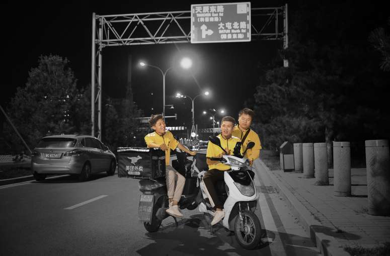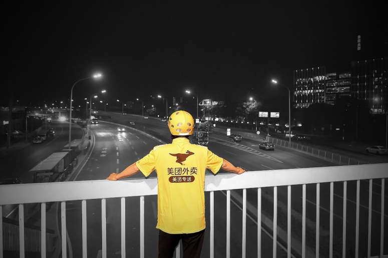 凌晨在北京不睡的人,多数来自特定职业,比如值班的医生,看门的保安,开卡车的司机和清运垃圾的工人。骑手是深夜的新鲜人。2013年,美团开设外卖业务后,一道接一道黄色开始在北京的夜间游窜。