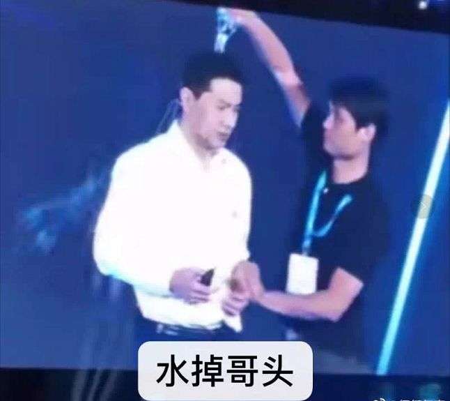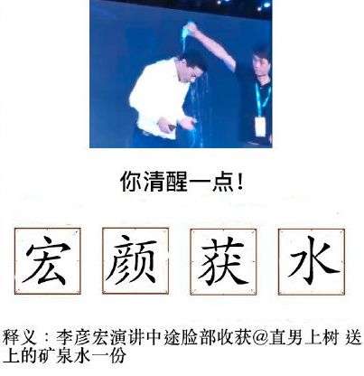 宏颜获水:李彦宏演讲中途,脸部收获矿泉水一份。