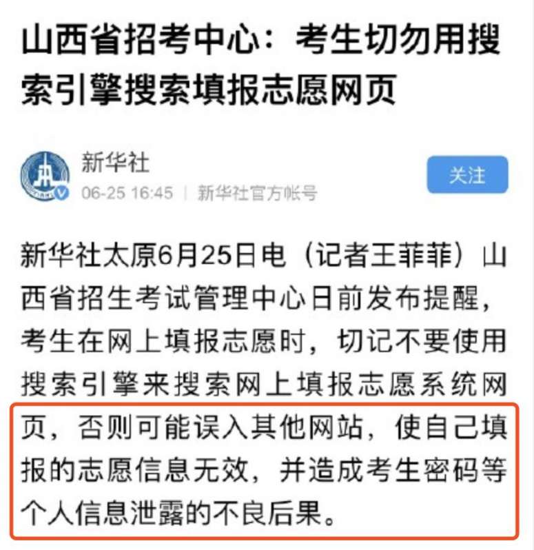 不久前,山西省招考中心发布通知,让考生及家长小心使用搜索引擎。