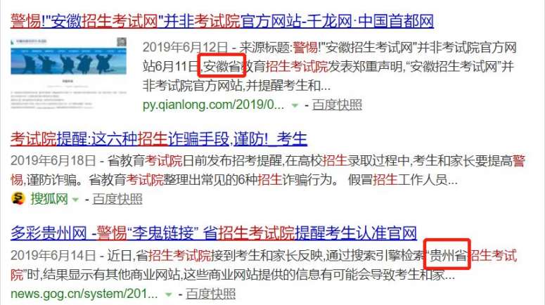 随后,贵州、安徽、广西等多省都发布了相关通知,称通过搜索引擎检索考试院,结果显示有令人真假难辨的商业网站,这些检索出来的信息,有可能会导致考生和家长的误判。