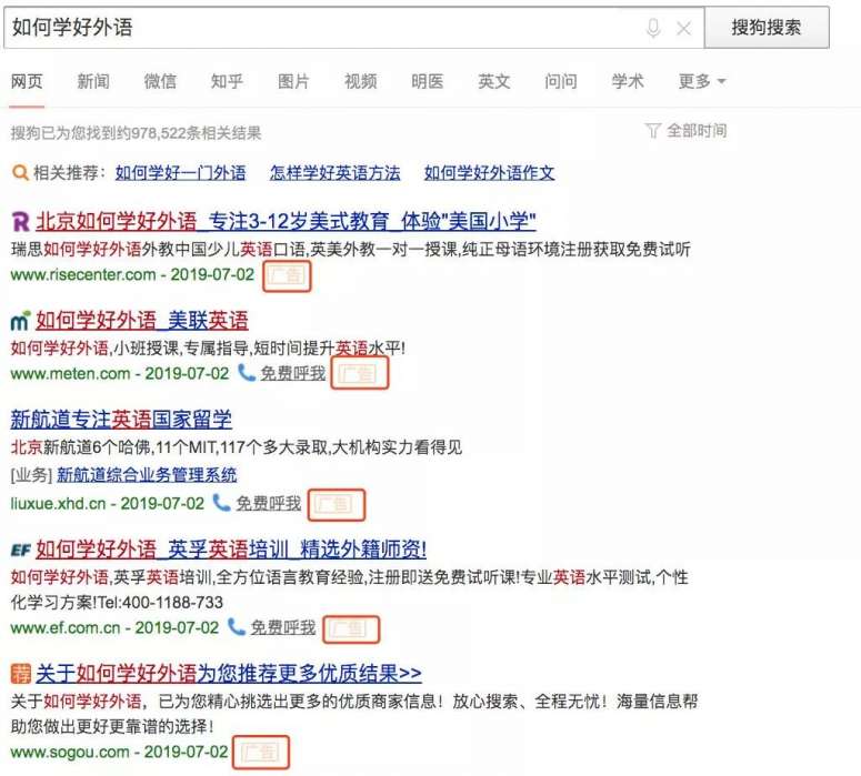 譬如,如何能学好英语,这个困扰了许多中国学生的问题。我们换了一家搜索引擎,用搜狗搜索出了如下结果: