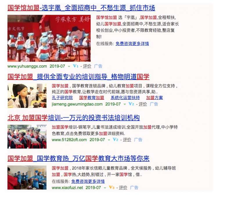 其中赫然在列的还有大量“国学培训班加盟”,只要3天,你再也不用花钱送孩子上国学班了,你自己就能成为国学大师。