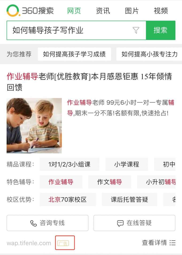 甚至于无数家长抓狂的“如何辅导孩子写作业”问题,广告也能解决。方法是没有的,但您可以报班。