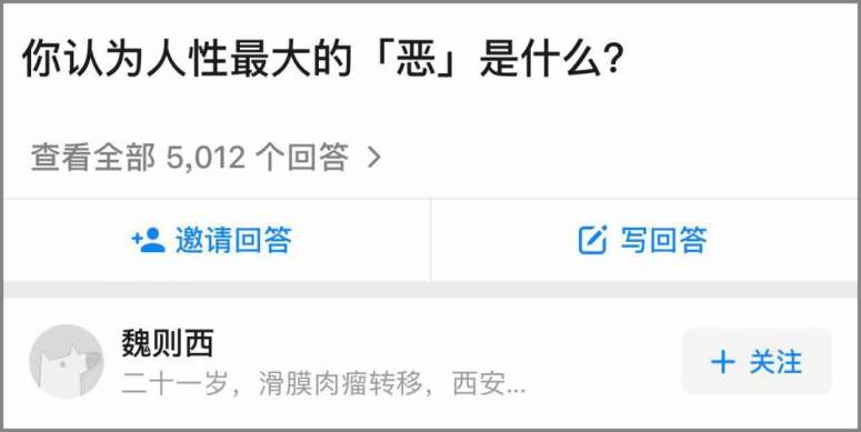 直到2016年2月26日,一位名叫魏则西的青年,在知乎上回答了一个叫作”你认为人性最大的「恶」是什么?“的问题。