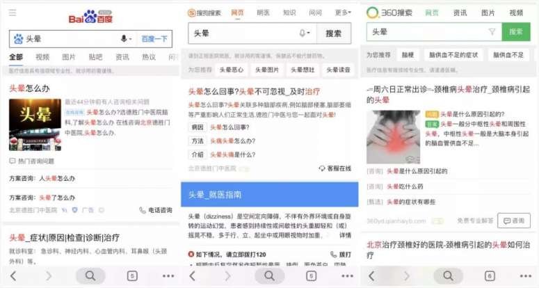 百度、360、搜狗三个搜索引擎检索“头晕”的结果
