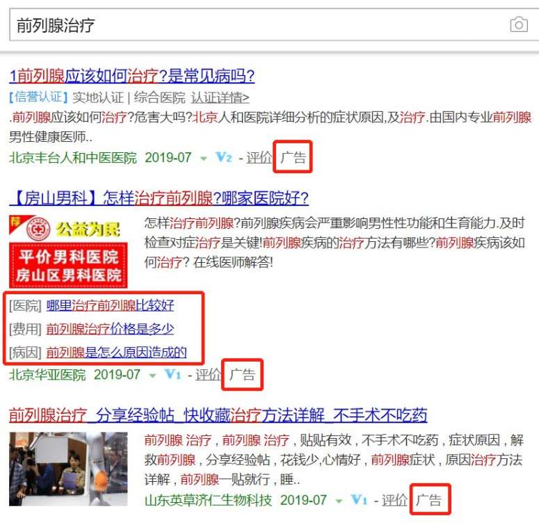 以关键词“前列腺治疗”为例,在搜索引擎中输入前列腺治疗,出来的网页上连续三条广告。
