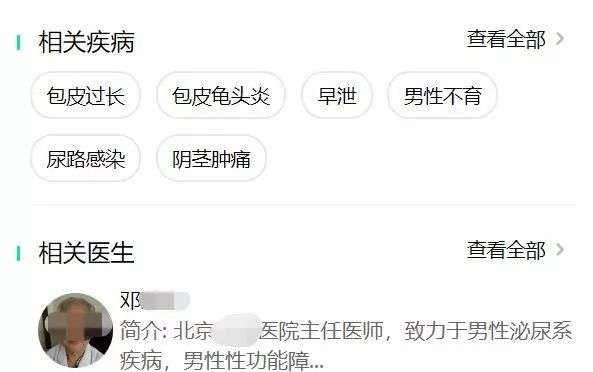 头像是一名头发花白还有些地中海脱发的老医生形象,据介绍,这位老医生致力于男性泌尿系统疾病、男性性功能障碍……医院能治疗的其他“相关疾病”也不少。