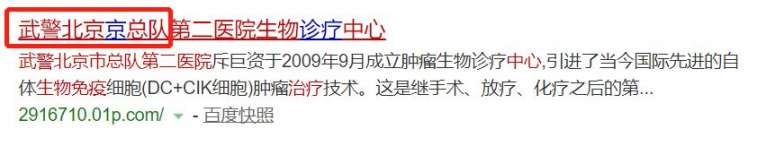 甚至当我们搜索当年直接坑害了魏则西的“武警北京总队第二医院生物治疗中心”时,百度上仍有打着它的名号,招摇撞骗的、真真假假的网页。