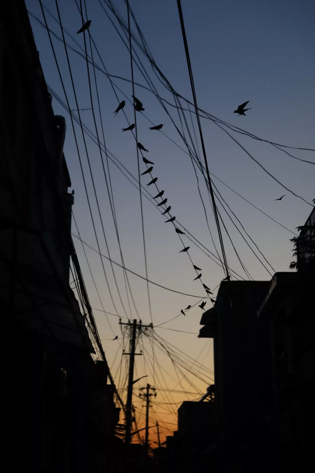 鸟儿密密麻麻,像音符停满电线。月色皎亮,衬得夜空中的这方景象,如同一幅剪影。