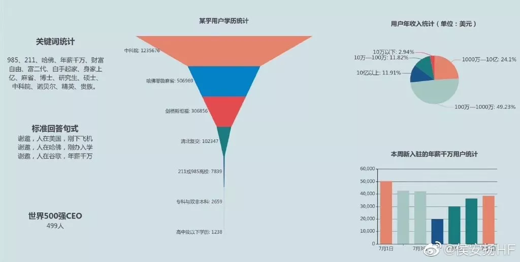以全民皆知的“高端社区”知乎为例,蹦跶的最欢的人,不是正在国外就是刚下飞机,学历个个常春藤,年薪全都过百万。