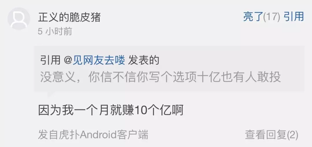 虎扑网友们也十分愉快地自我吐槽:十个亿的选项都有人敢投。