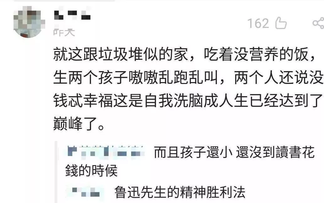 “不是我说,这种条件还生两个孩子,你有想过孩子的感受吗,你们自己过苦日子就算了,还非要让孩子一起来承受,送你们两个字:自私。”