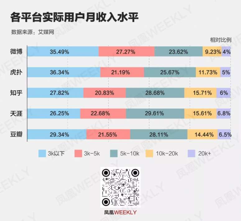艾媒数据显示,在知乎,月收入在2万以上的用户仅占6.57%。而在虎扑论坛,由于用户偏年轻、多为学生,56.04%的用户月收入低于5000元。用户基数众多的微博,更是超过60%的用户月薪在五千以下。