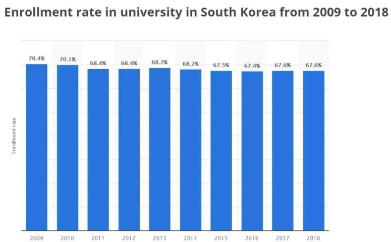 韩国大学升学率近十年来几乎一路下滑,中国大学的升学率却已经达到80%以上