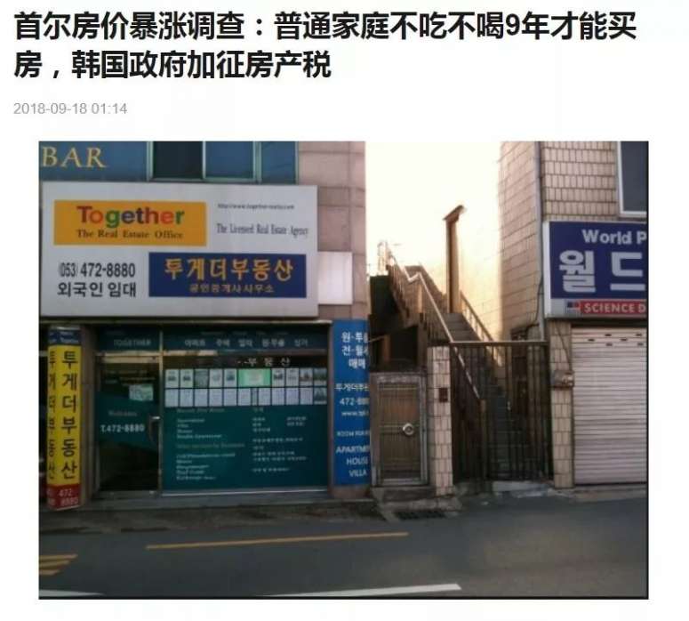 首尔房价暴涨调查:普通家庭不吃不喝9年才能买房,韩国政府加征房产税 (搜狐财经2018-9-18)