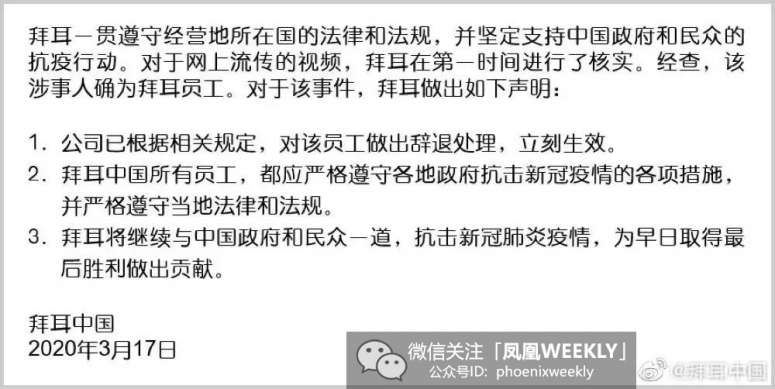 事后,有人发现该女子为德国企业拜耳的高管,随后拜耳证实了这一点,并表示已经开除员工。北京市公安局则依据出入境管理法,注销了其居留许可,并要求限期离境。