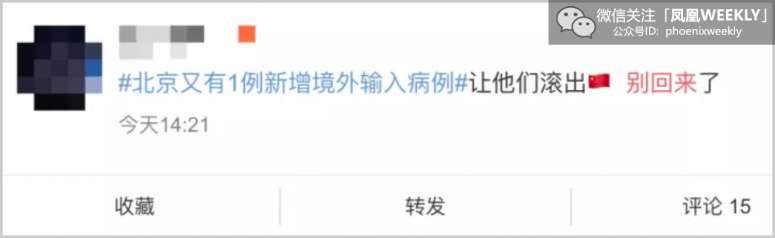输入病例不断,国内迟迟不能恢复正常工作生活,国人本就在焦灼情绪中。另一方面,一些输入人员又无理取闹,要求特权。以至于一些网友愤怒之下,直接针对所有回国人员,要求他们“别回来”、“滚出去”。