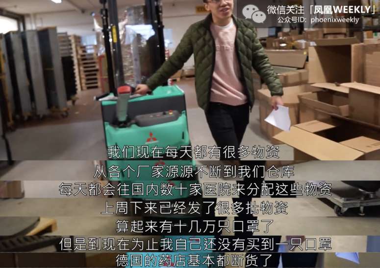 在德国从事物流工作的一位网友,在朋友@HeyToby 上传的视频中称,从疫情爆发开始,经过他手捐往国内的口罩有十多万只,但他自己却一只口罩都没买上。