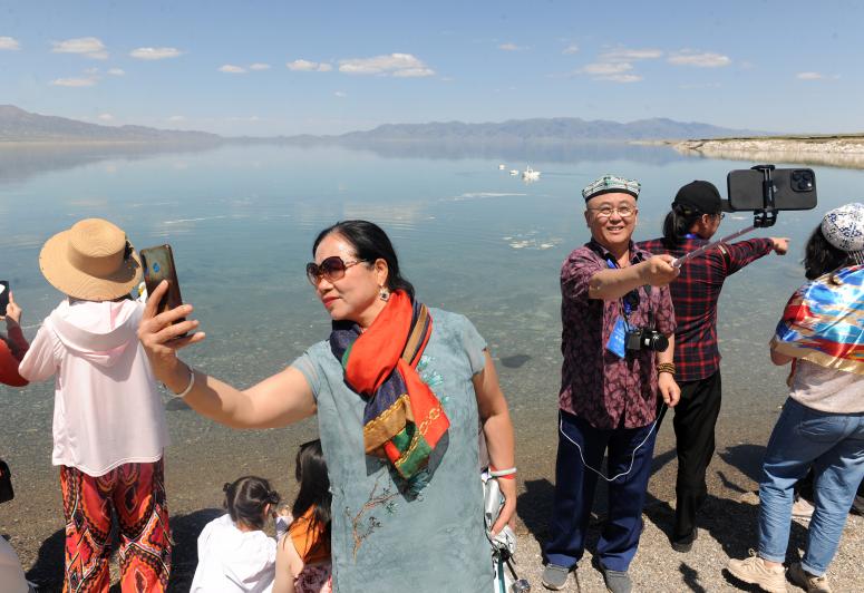 2023年6月9日,新疆博州,游客在赛里木湖景区自拍留影。 “体验广东早茶自由”“西湖景色到底有多美”“海盐旅游攻略来了”......在抖音种草榜上,每天都有近十个城市旅游词条霸占热搜。 最近,连拍火万柳书......