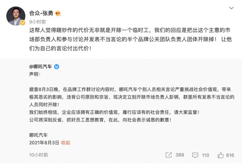 哪吒汽车联合创始人、CEO张勇在转发上述声明时表示,“这帮人觉得瞎炒作的代价无非就是开除一个临时工,我们的回应是把出这个主意的市场部负责人和参与讨论并发表不当言论的半个品牌公关团队负责人团体开除掉! 让他们为自己的言论付出代价”。