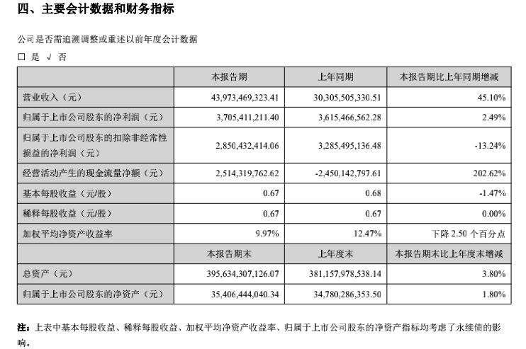 今年上半年,金科实现营收439.74亿元,同比增长45.1%;实现归母净利润37.05亿元,同比增长2.49%;扣非后归母净利润为28.5亿元,同比下滑13.24%。