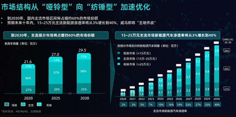 IHS Markit调研数据显示,未来10年内15万-25万元主流新能源产品市场渗透率将从3%增长到40%,而到2030年这一细分市场将占据约60%的市场份额,这意味着新能源汽车将迎来主流市场爆发,整体市场结构从“哑铃型”转向“纺锤型”。