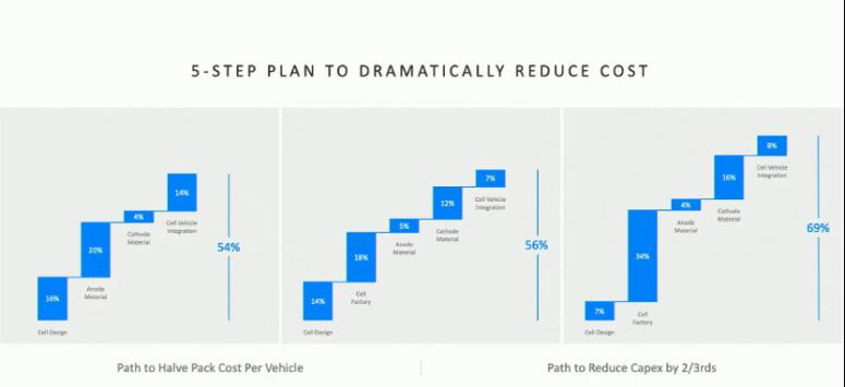 为此,在股东大会上,马斯克宣布了特斯拉降低成本的“五步计划”:电池设计、电池工厂建设、正极材料、负极材料、车辆集成五大板块,将为每辆特斯拉车辆降低69%的支出,电池成本则减少一半,进一步推动特斯拉未来的销量增长。