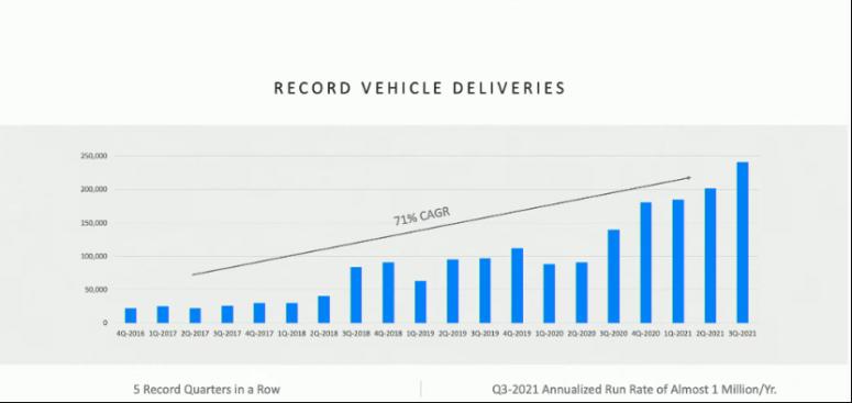 官方数据显示,在刚刚过去的2021第三季度里,特斯拉交付了共超过24万辆汽车,同比增长73%,并在全球生产了大约23.8万辆汽车。这已经是特斯拉连续 5 个季度实现“历史最高季度交付”,CAGR(年复合增长率)高达 71%。
