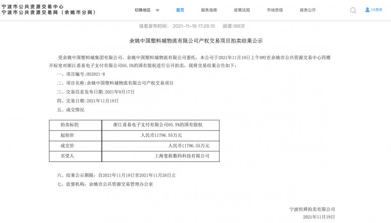11月19日,宁波市公共资源交易中心公布的一则消息显示,B站主体公司上海宽娱数码科技有限公司以约1.18亿元拍得浙江甬易电子支付有限公司65.5%的国有股权,成为控股方,正式获得支付牌照。